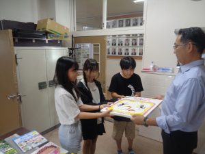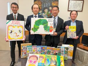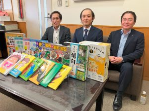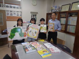 先日寄贈された本を図書委員会の皆さんに渡しました。本好きな子がたくさん増えることを願っています。