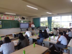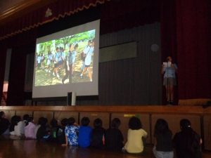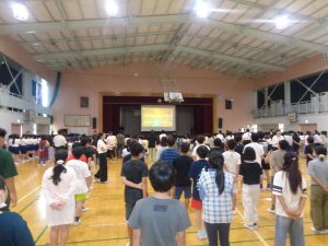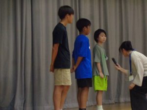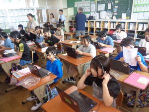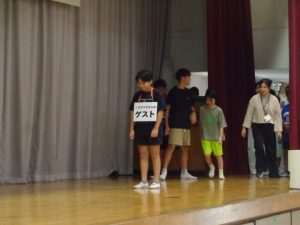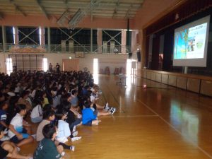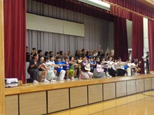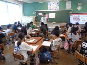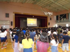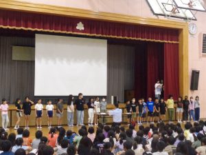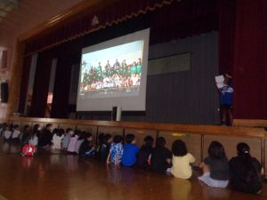 9月29日(月)の5時間目、エンジョイタイムとハッピーウェルカム集会の練習を行いました。エンジョイタイムでは、夏休みにハワイ・ホノルル市のノエラニ小学校を訪れて国際交流をしてきた児童が、現地での様子を映像を使って発表しました。参加した子どもたちは、自分たちの体験をわかりやすく伝えてくれました。その後、10月6日(月)に境小学校に来校するノエラニ小学校の児童や先生を迎える「ハッピーウェルカム集会」に向けて、歓迎の練習を行いました。どの児童も、発表や練習に真剣に、一生懸命取り組んでいました。