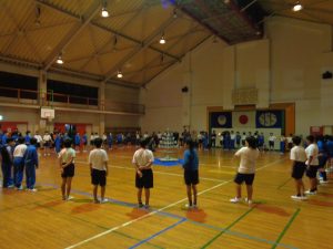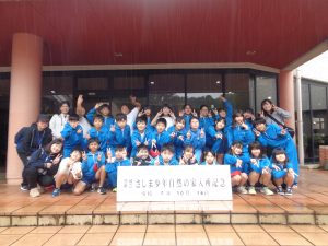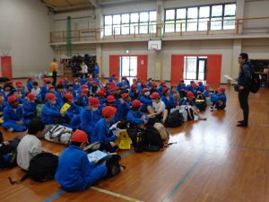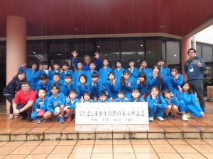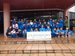 <さしま少年自然の家に到着して>玄関の前で記念写真を撮った後、入所式を行いました。