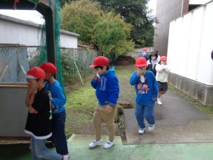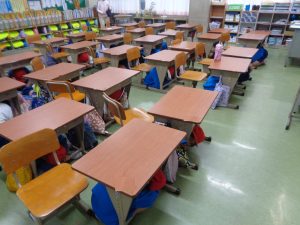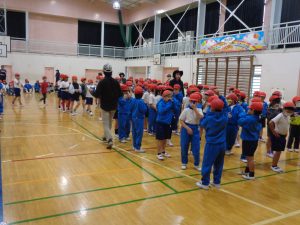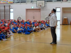 本日、地震と火災の発生を想定した避難訓練を行いました。あいにくの雨天により、避難場所を急遽変更することとなりましたが、子どもたちは「お(おさない)・か(かけない)・し(しゃべらない)・も(もどらない)」の合言葉をしっかり守り、立派に行動していました。