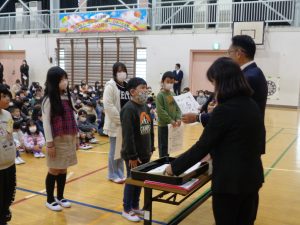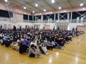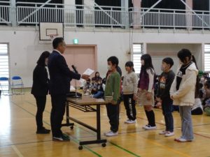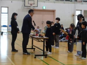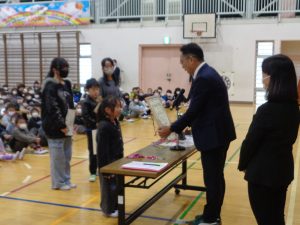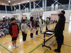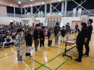 今日は、明日から始まる冬休みを前に、全校集会が開かれました。集会に先立って表彰が行われ、スポーツや芸術など、これまでの子供たちのがんばりが数多く紹介されました。