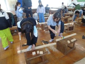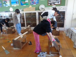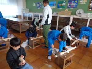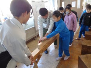 実際に、かんな削りやのこぎりを使った体験活動も行い、子供たちは初めて触れる道具に少し緊張しながらも、目を輝かせて取り組んでいました。木が削れる音や手触りを感じながら、ものづくりの楽しさを実感する貴重な時間となりました。篠原工務店の皆様、貴重な学びの機会をありがとうございました。