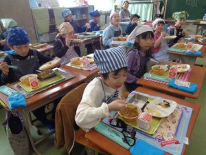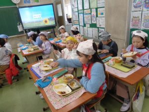 2月18日(水)の給食では、境町産の常陸牛を使用したカレーライスが提供されました。ライスにも境町産のお米を使用し、地産地消を大切にした献立となりました。当日は、町で常陸牛を生産されている方をお招きし、交流給食も実施しました。子どもたちは、生産者の方と一緒にいつも以上の笑顔でおいしく給食をいただきました。また、その様子を取材するため、新聞社も訪れました。
